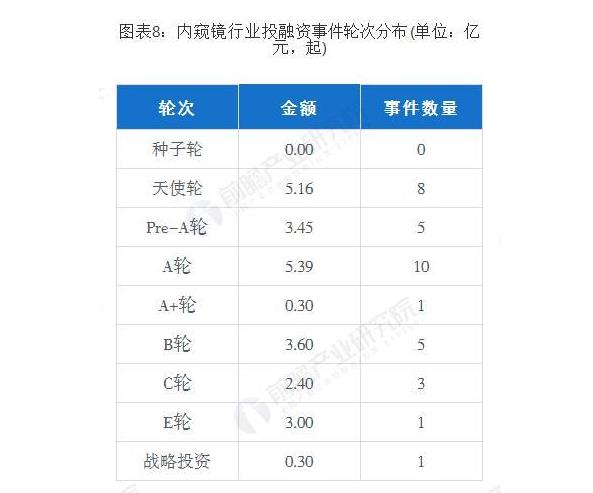 根据IT桔子统计,从内窥镜行业投融资事件轮次分布上来看,截至目前,金额及数量主要分布在天使轮至A轮。截至目前,内窥镜行业天使轮融资金额为5.16亿元,事件数量为8起;A轮融资金额为5.39亿元,事件数量为10起。