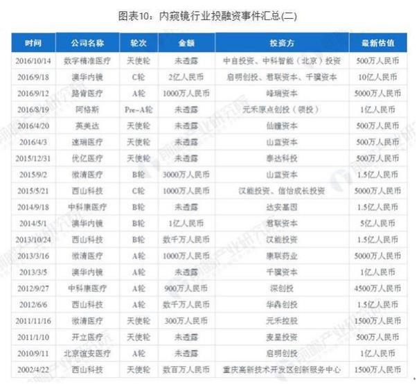 根据IT桔子统计,截至目前,内窥镜行业投融资事件数量达到34起,金额合计23.6亿元,金额最大的一笔为澳华内镜的D轮融资,规模达到3亿元人民币,投后估值达到15亿元人民币,此次投资方为济峰资本(领投)、君联资本、启明创投等。